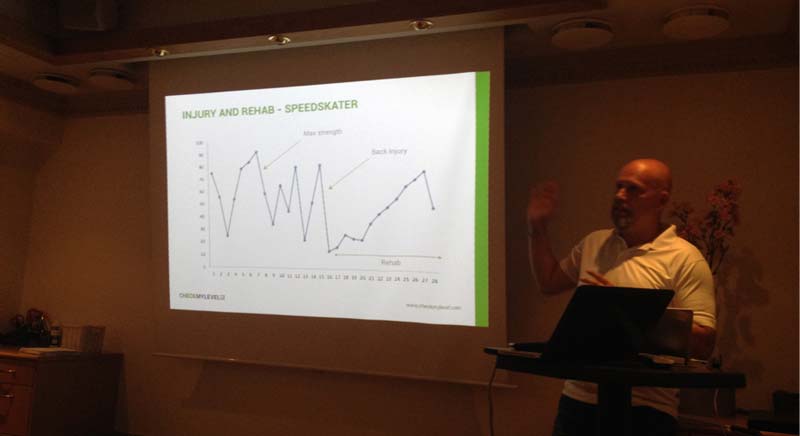 Heart Rate Variability (HRV) is an excellent marker for overall health, but it was great to see a comparison between data of HRV and fatigue metrics of their system. At times, the HRV was parallel to their scores, and sometimes the data seemed to lag or be polar opposite. What was perhaps the best presentation on sharing data I have seen in years was the timelines shared with real athletes. Every slide that he presented was textbook in how companies should engage their users. Not sharing data is a sign of selling vaporware, meaning either the product doesn’t work or nobody uses it. Time after time, a firestorm is created (sometimes a coverup) when a coach or company is asked to see data. If one is using a monitoring device for a season, show us the data! Juha showed an array of professional athletes and explained the simple metrics and how their season went. Injury was the most obvious sign of readiness drop, and it was awesome to see how rehabilitation was visualized with the data. The chart showed what happens if one returns a little too quickly from rehabilitation with a crash immediately after resuming competition. Perhaps some simple algorithm can calculate readiness based on how long one has reached stabilization enough to get back on the field. Without quantification, it will be an educated guess, but perhaps the use of a good monitoring system can help make the decision more precise.