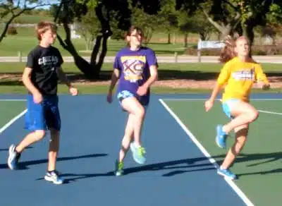 The complete six-part series can be done with each activity ranging from 50 to 100 meters. Our cross country runners take about seventeen minutes to complete the entire workout, and they average about 1.6 miles worth of activity before they begin their training for the day. The length of each activity gets shorter as the season progresses. At a certain point, we switch from what we call Gravity Constant to Gravity Constant Complexed, which involves a much shorter period of activity, but with various activities combined, like executing a Skip-Run-1-2-3 while doing reverse arm swings. This reduces the total warm-up time but makes the sequences even more challenging.